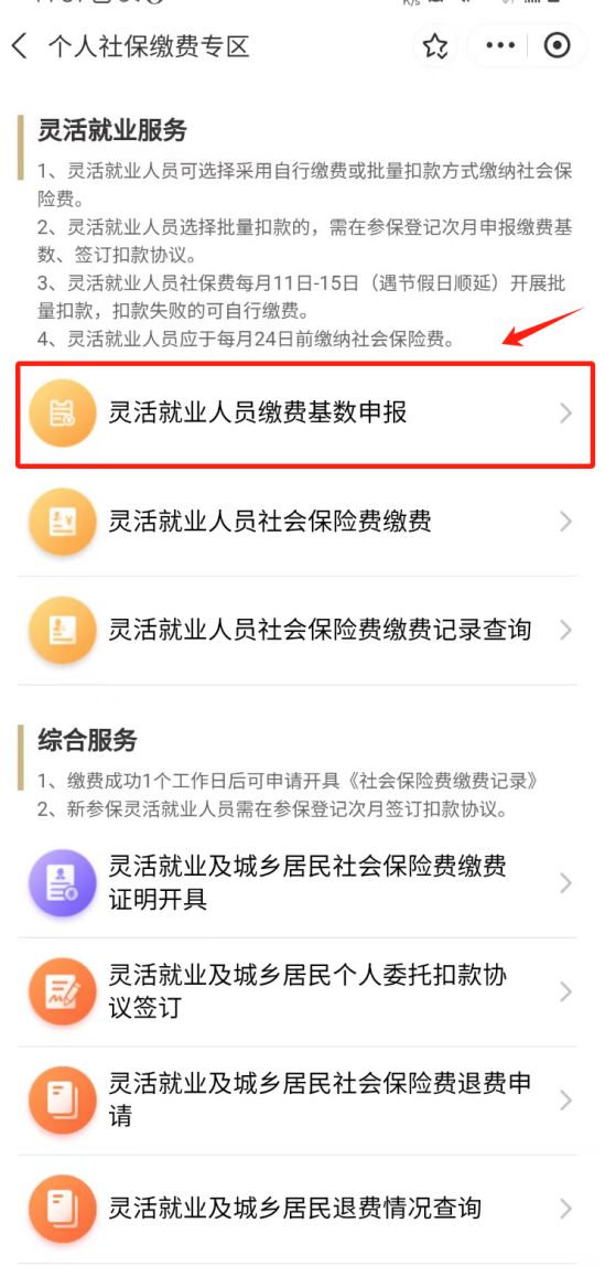 1.打开“随申办市民云”(APP、微信小程序、支付宝小程序),首页下滑至“精选主题”模块,点击“社保缴费”,进入“个人社保缴费专区”,下拉至灵活就业服务版块,点击“灵活就业人员缴费基数申报”。