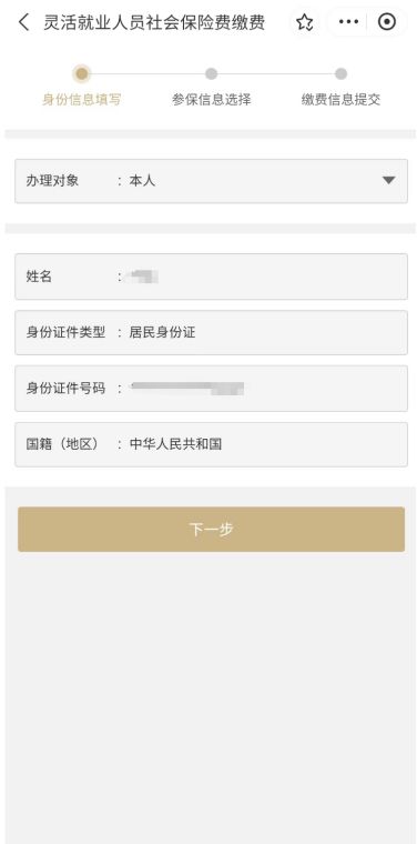 2.办理对象可为“本人”或“他人”,确认无误后点击“下一步”。为他人缴费时,需填写姓名、身份证件类型、身份证件号码和国籍(地区)。