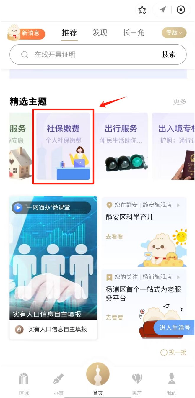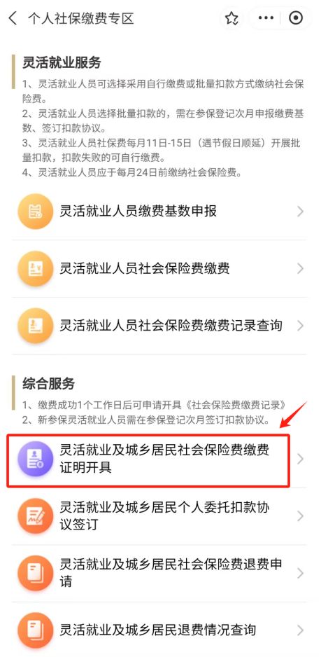 1.打开“随申办市民云”(APP、微信小程序、支付宝小程序),首页下滑至“精选主题”模块,点击“社保缴费”,进入“个人社保缴费专区”,下拉至综合服务版块,点击“灵活就业及城乡居民社会保险缴费证明开具”。