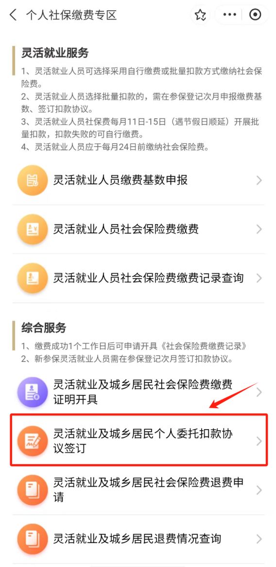 1.打开“随申办市民云”(APP、微信小程序、支付宝小程序),首页下滑至“精选主题”模块,点击“社保缴费”,进入“个人社保缴费专区”,下拉至综合服务版块,点击“灵活就业及城乡居民个人委托扣款协议签订”。