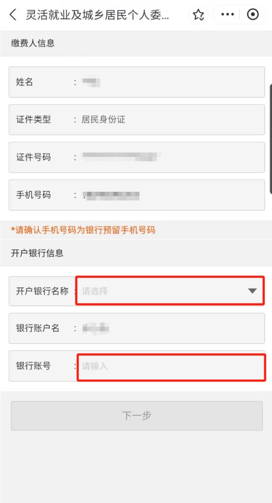 2.确认缴费人信息,填写“银行预留手机号码”,选择“开户银行名称”,输入“银行账号”后,点击“下一步”。